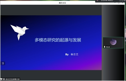 杨芸芝博士做了题为“多模态研究的起源与发展”的讲座,梳理了多模态研究的三个发展阶段,即多元符号发展阶段(2005年以前)、理论建设阶段(2006年至2011年)和学科交叉融合的新时期(2102年至今),展现了当前在诸多学科领域中以多模态研究为主题的具体方向和常见的实证研究,并进一步介绍了多模态研究常运用的理论资源——视觉语法理论。杨芸芝博士指出,多模态研究者在关注更多社会符号的同时,需要注重不同学科视角的融合,而且还要谨防滥用,注重贴合度。