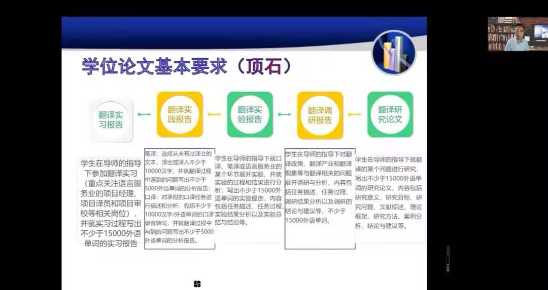 翻译硕士学位点的建设情况,以及目前面临的挑战和问题,尤其是提到了希望赵老师能够从学位论文(实践报告)写作方面予以具体指导。接着,赵老师从翻译的三个主要的问题“何为译?为何译?译何为?”着手,以幽默风趣的举例说明“立文字”的重要性,以及新时代我们如何为党育人,为国育才,从“讲好中国故事,展示全面、立体、真实的中国”等方面,在提升国际传播能力方面,如何加强翻译硕士学位点建设和人才培养。同时,赵老师也提出翻译的4.0,即大数据、人工智能和互联网等对于整个翻译教学能力测试、语言服务应用的研究。赵老师提出翻译硕士的培养应当主动服务需求、坚持问题导向、全面提高质量,大力提升专业学位研究生教育质量要联合行业产业、提升导师育人实践能力、强化行业产业协同作用。