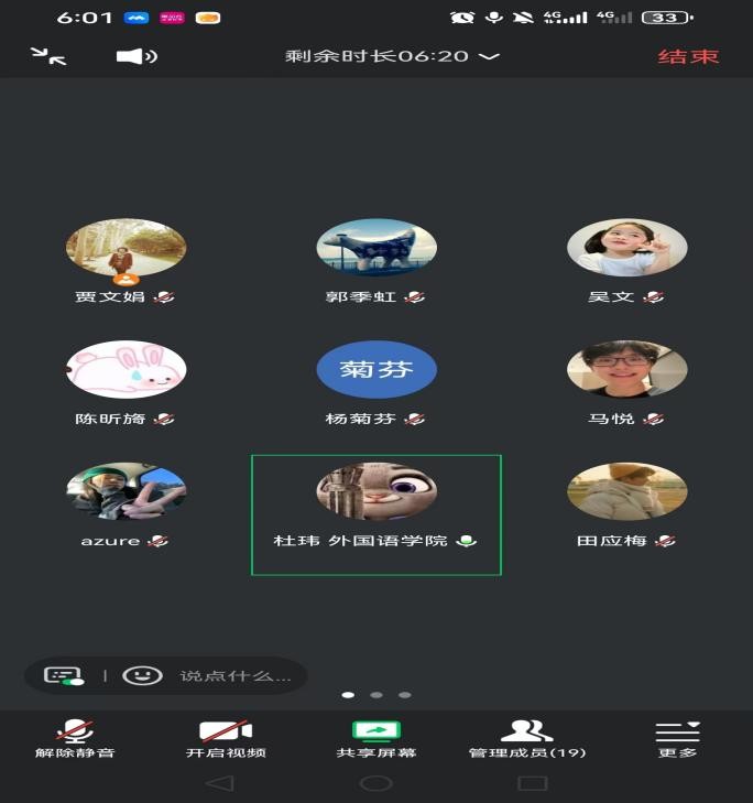 通过腾讯会议线上举行2021级翻译方向自主实习与基地实习总结研讨会。会议由郭季虹老师主持,贾文娟副院长、杜玮、刘艳芬、常青等指导老师以及14名实习生代表共同参加。
