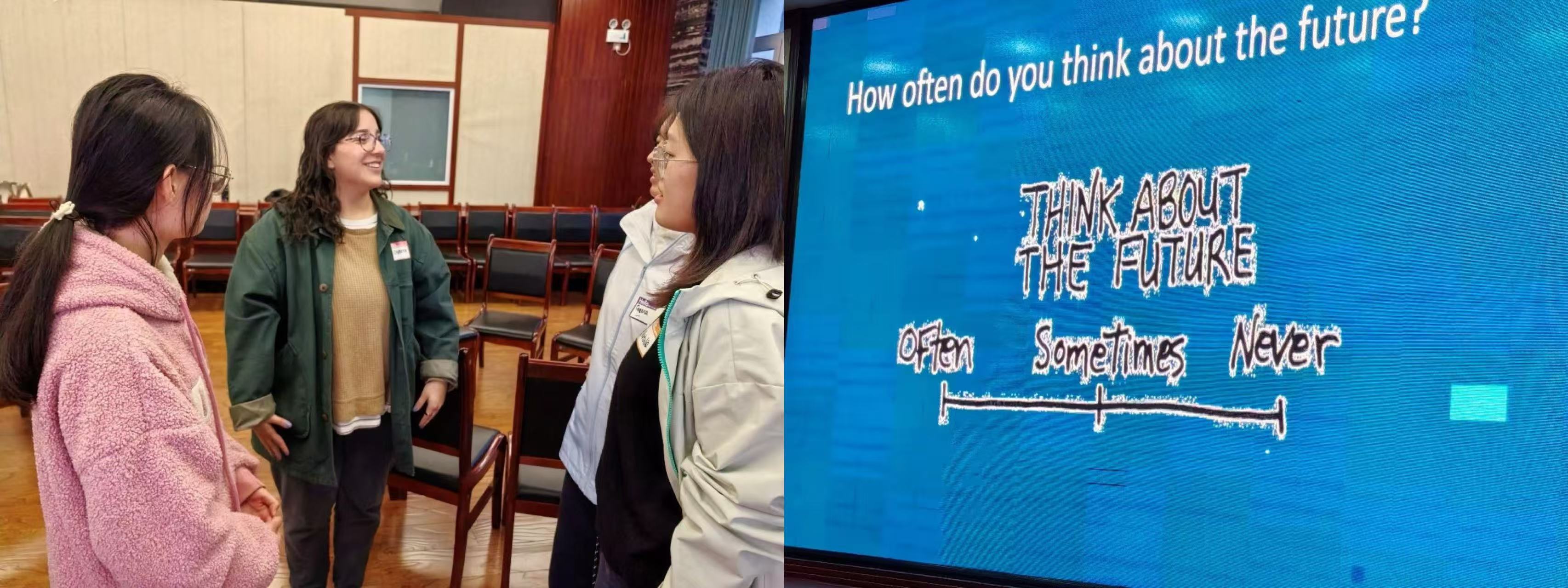 参与者根据姓名贴纸的颜色进行分组,围绕“未来与技能”主题展开讨论,深入探讨了“硬技能”与“软技能”的具体内涵及其实际应用。在思维的交流与碰撞中,同学们不仅加深了对自身能力的认识,也提升了英语表达与团队协作能力。