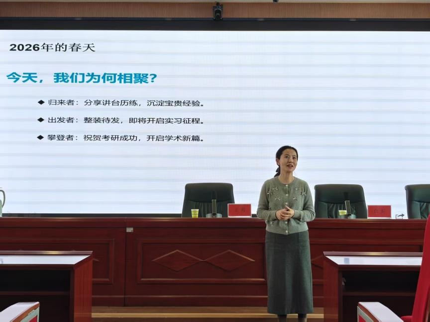 会上,贾文娟首先介绍了本次实习总结研讨会的目的与意义,梳理了2022级英语师范实习的整体情况,并详细说明了2022级与2023级的实习安排,明确了不同阶段的实践目标与成长要求,为即将步入实习岗位的2023级师范生搭建了清晰的行动框架,也使在场师生对师范专业人才培养有了更深的理解。